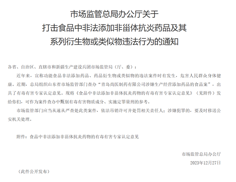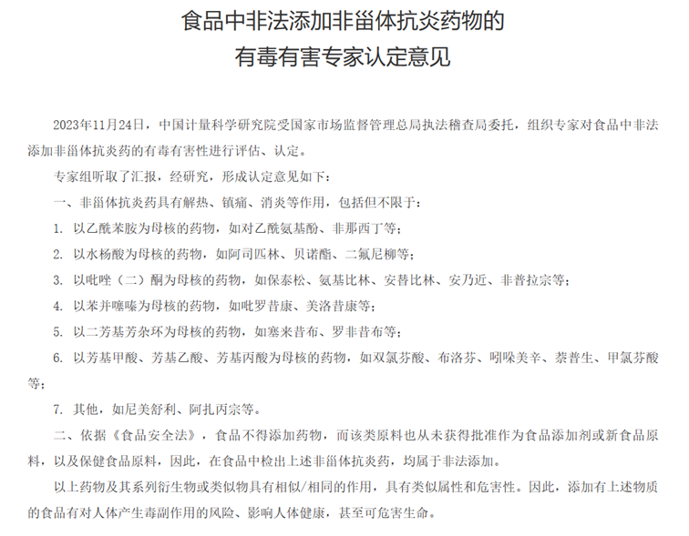 高壓打擊態勢:2024年初,國家市場監管總局已專門發布通知,部署嚴厲打擊食品中非法添加NSAIDs及其衍生物/類似物的違法行為,為執法和定罪量刑提供明確依據。